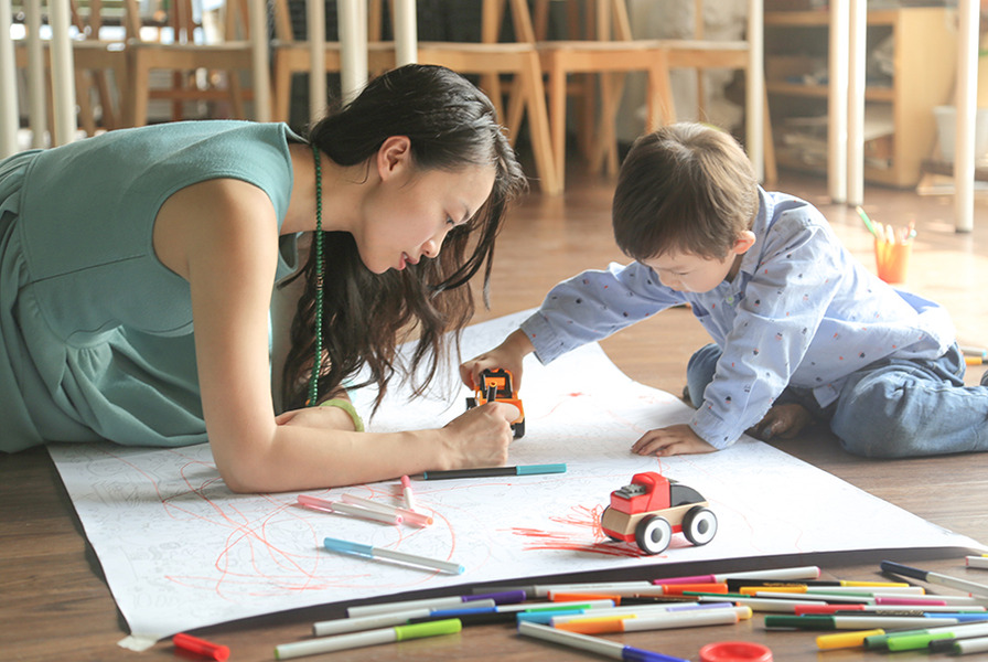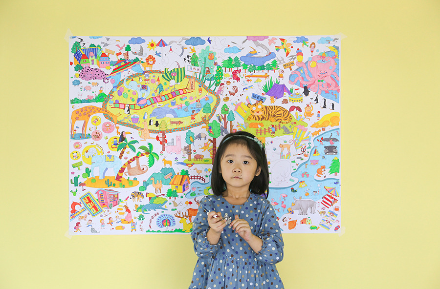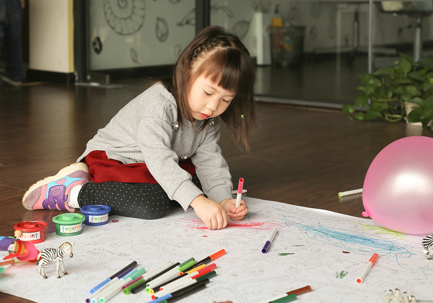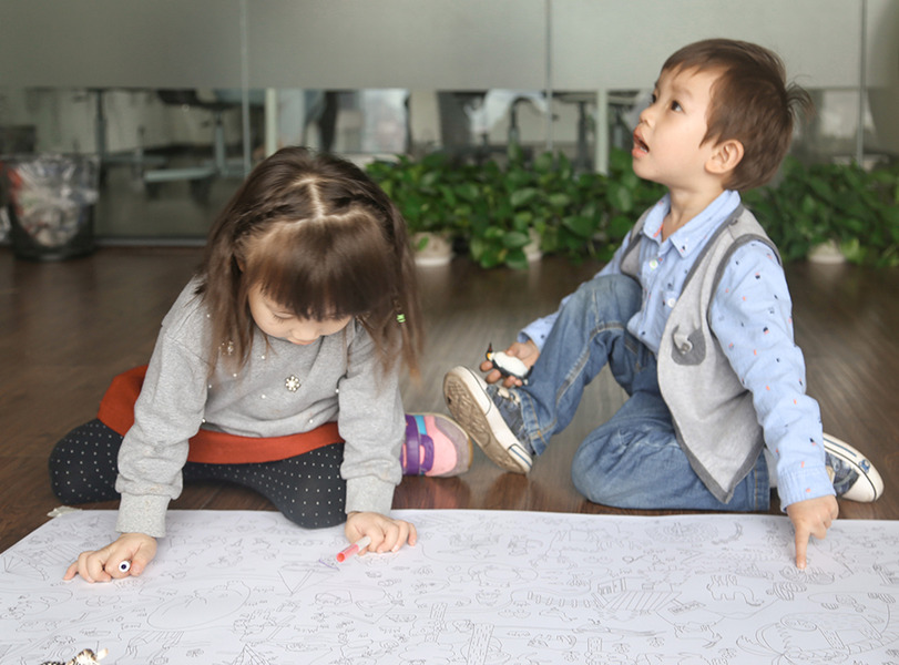 4.用大画毯进行涂色,由家长和孩子一起完成