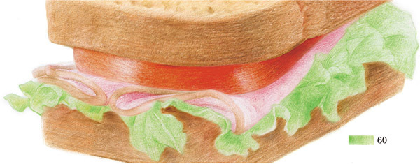 两片面包,夹上西红柿、培根和生菜,几分钟就可以做成一份美味的三明治早餐了!画面包片的时候,下笔要轻一些,注意表现出面包松软的质感。