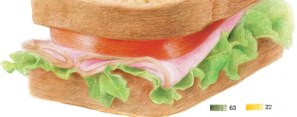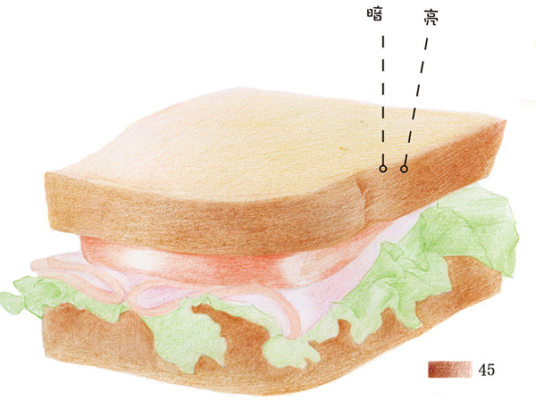 STEP4:用45号红赭色画出上层面包侧面的暗部及褶皱部分。由于菜叶会在下层面包侧面形成投影,所以下层面包要沿着菜叶边缘整体加深。