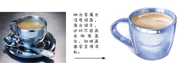 在刻画这种光洁度较高的物体时,应注意不要画出所有的高光,而要画出主要的高光与反光。
