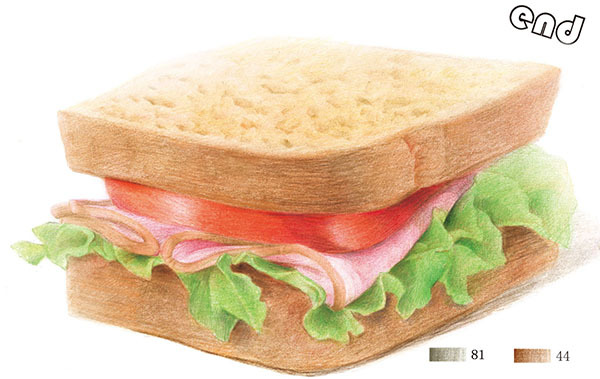 STEP10:用81号深灰色画出三明治的投影,投影边缘要模糊一些。最后用44号熟褐色加重刻画面包与桌子的衔接部分。
