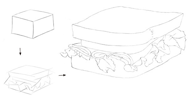 STEP1:先画线稿,画出三明治的整体轮廓,再依次分出每个食物的轮廓。菜叶为最难的部分,同样先画出大块的形状,再仔细刻画叶子的转折。