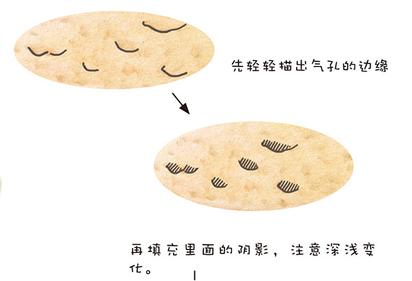 STEP5:画出面包横截面上松软的气孔以体现质感。可着重刻画前面几个气孔,后面的轻轻带过。这一步下笔不能太重,否则气孔会显得生硬和不自然。